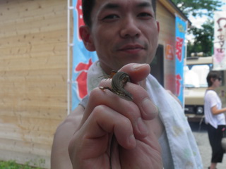 けせん朝市で捕獲したとかげ。陸前高田の方々は、トカゲやヤモリなど爬虫類好きです。トカゲを捕まえた、鈴木旅館若主人。