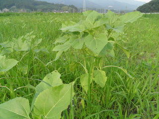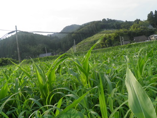 矢作町のトウモロコシ、かろうじて、トウモロコシが草に競り勝っています。