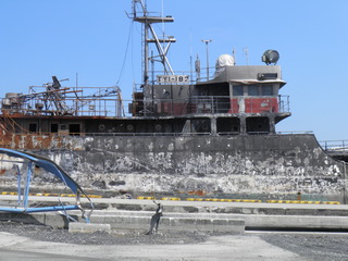 気仙沼市。火災にあった船がそのままの状態で残っています。