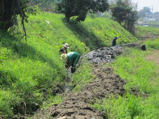 その後、自治労連さんから借りたスコップを、用水路で洗い、返還です。