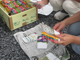 福井の高齢者が作ったナイロンタワシや、青山ガーデンさんから届けられた花の種も配りました。