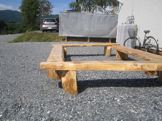 伊勢原森林里山研究会の皆さんが、お盆中に作成したベンチやプランターが置いてあります。この仮設住宅とつながったんですね。