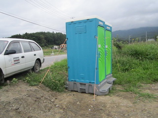 大丈夫かもわかりませんが、台風が近づいていますし、仮設トイレを固定させる必要があります。