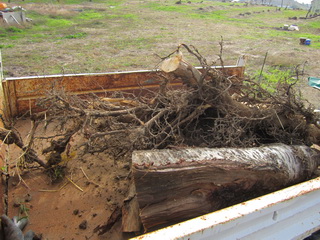 軽トラダンプに積んだ倒木を木材関係集積場に運び込みます。