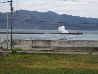広田町大野湾です。地盤沈下が大きかったこと、波消しのテトラポットが流されてしまったことなどで、防波堤を越える波が打ち寄せてくるようになりました。
