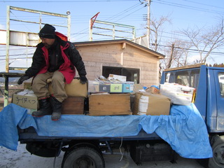 ドライビングスクールのテントから、けせん朝市会場に、次々と物資を移しています。