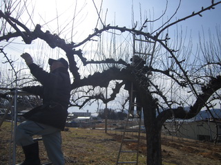 リンゴの剪定作業。親子で作業です。