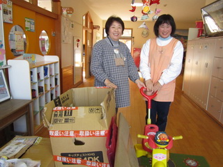 広田保育園に、三輪車、テーブル等を届けました。