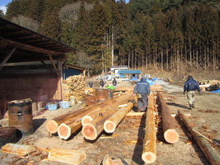 立ち枯れ杉を伐採して、皮剥作業中です。