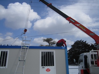 コンテナハウスにワイヤーをかけています。作業は鈴木旅館お父さん。