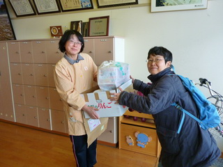 福井の青池さん、東京の原さん、小林さんから届けられたマスクの贈呈です。