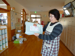 広田保育園に子ども用マスクとおんぶひもを届けました。