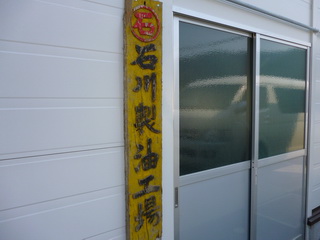 プレハブの工場の玄関に、石川製油工場の看板が。