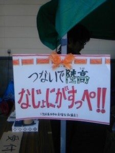 現地報告 2011-04 2025.10.072011.04.02 4月2日 陸前高田市は良い天気が続いています。しかし、まだまだ寒く何枚も着重ねして活動しています。 陸前高田市災害ボランティアセンターのスローガンも決まり、その看板の写真を添付します。 つないで陸高なじょにがすっぺというスローガンです。皆が一つにまとまって頑張っています。 自衛隊との入浴サービス打ち合わせ、陸前高田市との宅老所打ち合わせ、第1中学でイベントを行うことも決定し、アチラコチラと忙しく走り回りました。