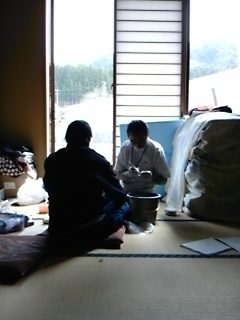 その炭の家で入浴サービスをするための打ち合わせです。下矢作コミセンに避難されている方で、入浴介助ができなく、全く風呂に入れていない方がいます。