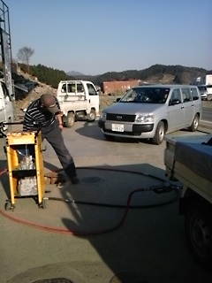 地下タンクから手動でガソリンを入れていきます。復興が少しずつ進んでいることを感じました。