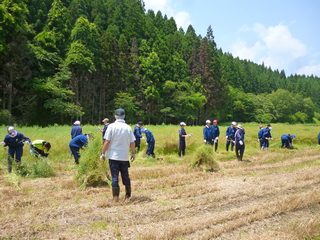 上長部で菜種刈り取り作業に参加する花巻の中学生の皆さん。