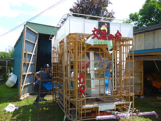 午前の健康測定メンバーで、そのまま愛宕下の行灯七夕山車作業に向かいます。