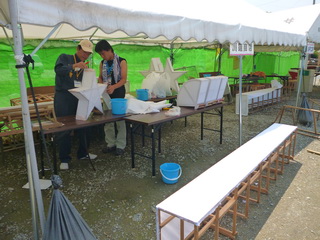 行灯七夕の飾り付け枠に障子を貼っていく作業です。