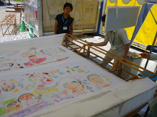 行灯七夕の枠に、子ども達の絵を貼り付けていきます。