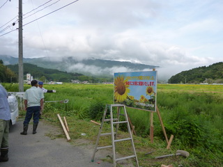 タネッコまくべえ会の皆さんが看板取り付け作業をしています。