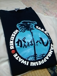 区長さんから、ポスターとTシャツを作ったと言われてビックリです。有名になった、高田松原の一本松を中心に、「がんばっぺ」と書かれたデザインです。Tシャツは義援金込みで、2500円です。