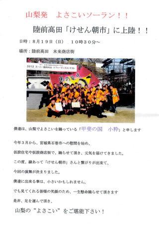 山梨のヨサコイチーム「甲斐の国 小粋」の皆さんが、けせん朝市で演舞してくれます。