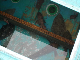 舟の中のいけすで泳ぐ、ヒラメとアイナメ。