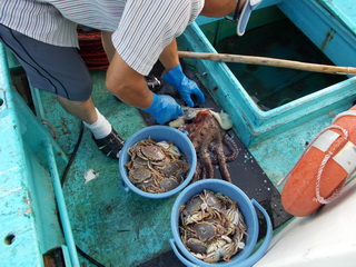 船の生け簀からカニ、タコを取り上げていきます。いただきました。