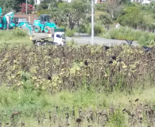 多くのヒマワリで種収穫時期なのでしょう、カラスと雀がひまわり畑にいます。