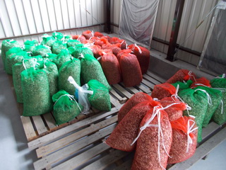 大急ぎで収穫した種が雨に濡れないように、タマネギネットに詰め、車の中に積み込みます。