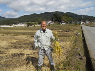 ほんの少しだけ稲を刈り、後はKさんと話をします。