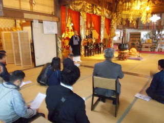 普門寺で住職から話を聞きました。この日は、私たちだけではなく、女性グループや、曹洞宗関係の皆さんなど、多くの方が参拝に来ています。