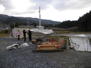未来商店街、けせん朝市の皆さんでテントの修復作業。