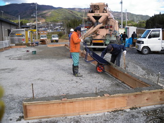 けせん朝市の新築建設は基礎部分にコンクリートを流し込む作業をしています。