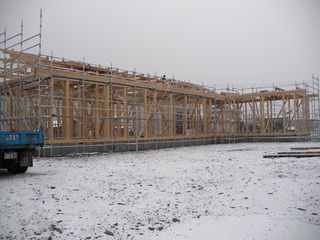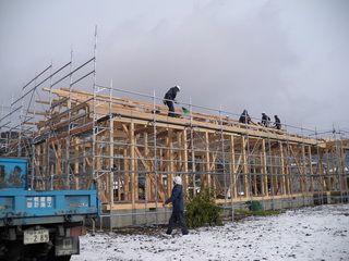 ほぼ棟木が組まれた所で、天気も回復に、晴れてきました。