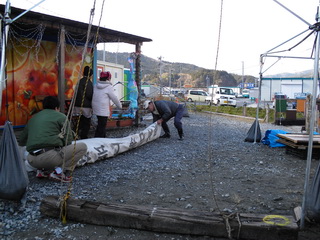 飛ばされないように、他のテントも幕を外して、梁だけにしていきます。