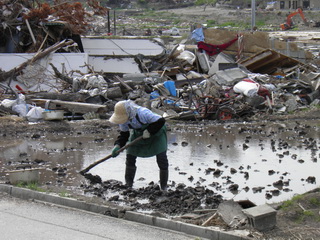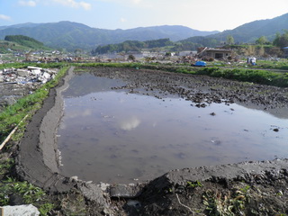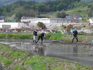 瓦礫の中で作業が進みます。明後日には田植えがしたいと言っていますが。