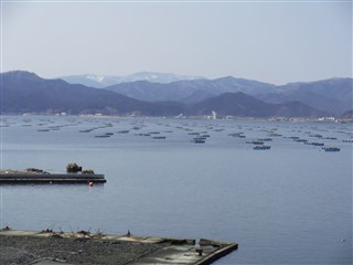 広田湾に浮かぶ養殖筏。対岸が高田町。