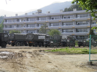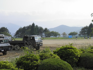 グラウンドでは、自衛隊の車の横で野球部が練習していました。