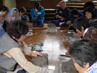 女性陣は粘土団子作り。話の花が咲きます。自治労連さんも参加です。