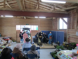 民謡ショーの始まり、雨降りで寒い中、多くの方が来てくれました。朝市には民謡が似合います。