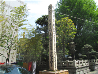 気仙杉の回向柱が立っています。柱の上方に結ばれている紐が本尊の薬指に結ばれています。
