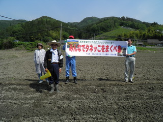 タネっこまくべえ!のかけ声とともに種を一斉に蒔きました。
