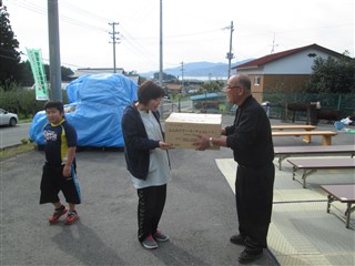 小泉公民館にて、竹駒保育園への支援物資贈呈です。