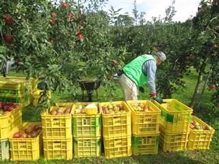 チームふくいの皆さんが、落下リンゴを集める作業をしています。