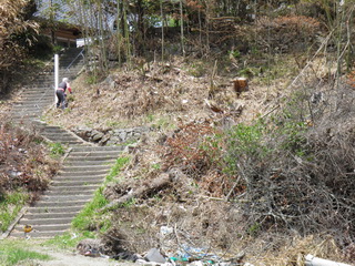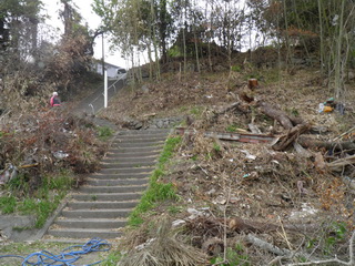 今日は、黙々と作業をします。お寺の法面にある、木や竹、瓦礫の撤去です。