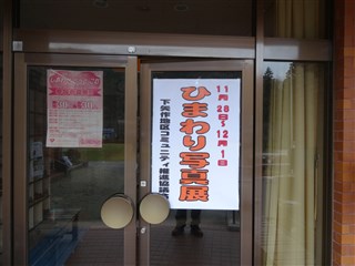 下矢作コミセンの玄関に貼られた案内看板。Sさんから支援でいただいた大判プリンター用紙を使用しています。