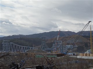 一本松周辺の工事。希望の架け橋と名付けられた、土砂運搬用ベルトコンベアが急ピッチで作られています。夜は一本松と共にライトアップされています。