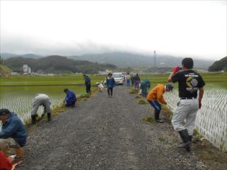 あいにくの雨の中でしたが、福岡応援団、地元下矢作の皆さん約60人がひまわりの苗を定植する活動を取り組みました。